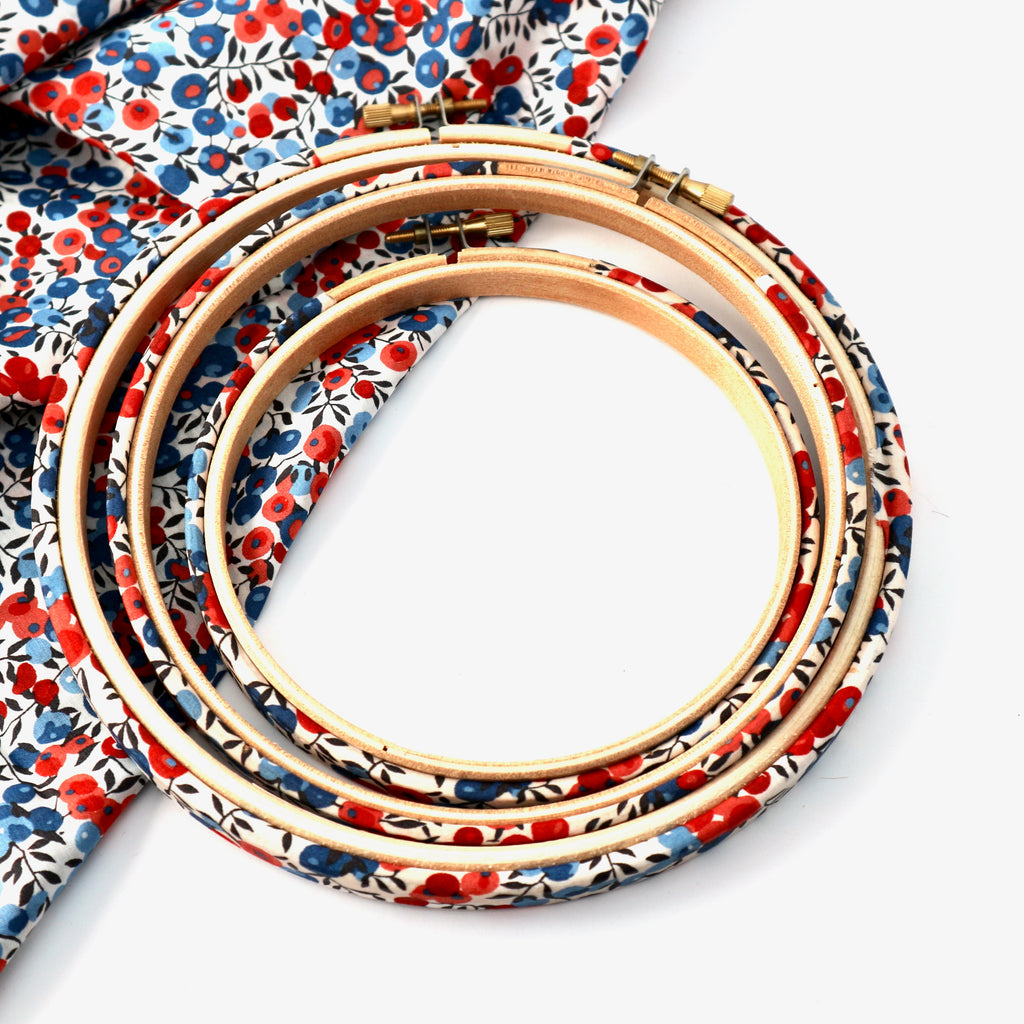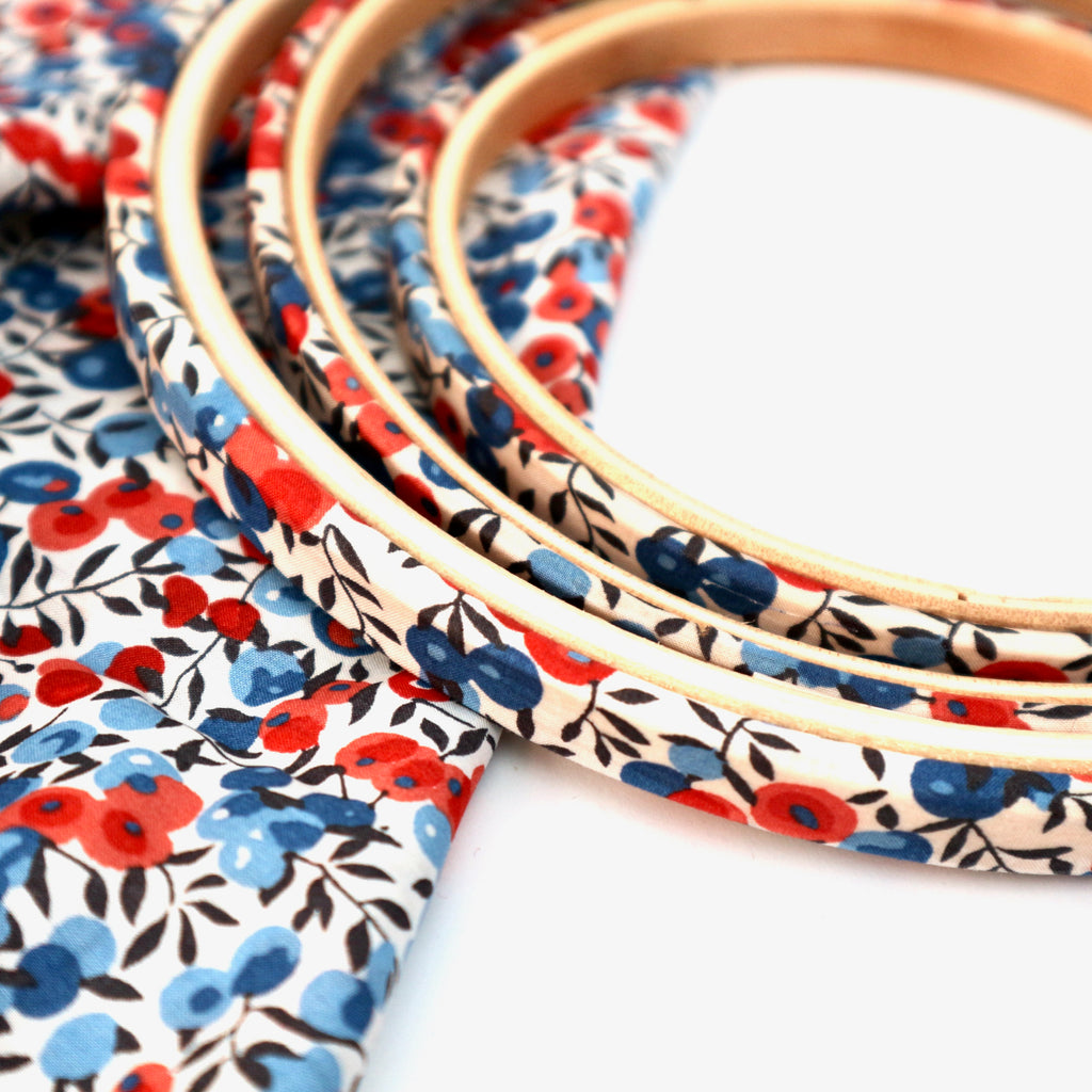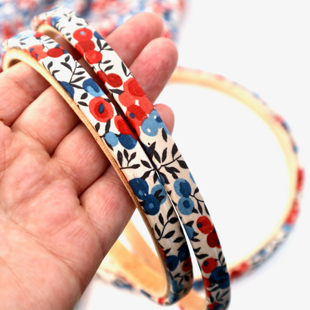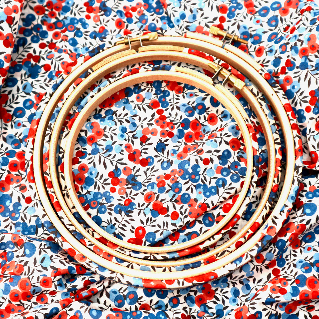 Blue and Red Fabric Covered Embroidery Hoops. Wiltshire Berry Tana Lawn Print