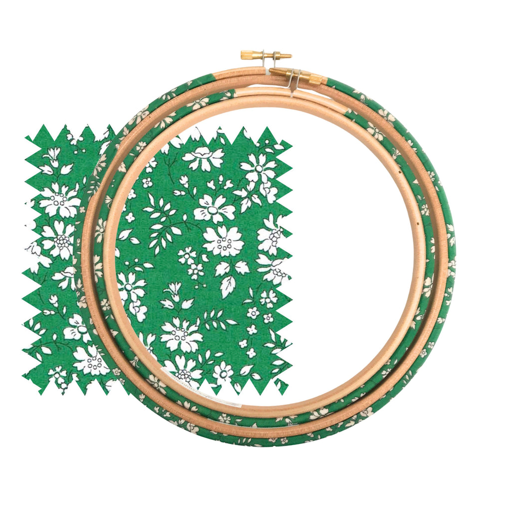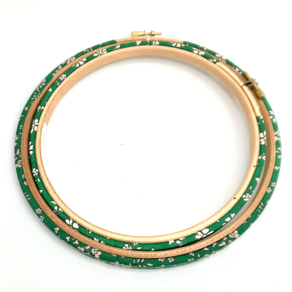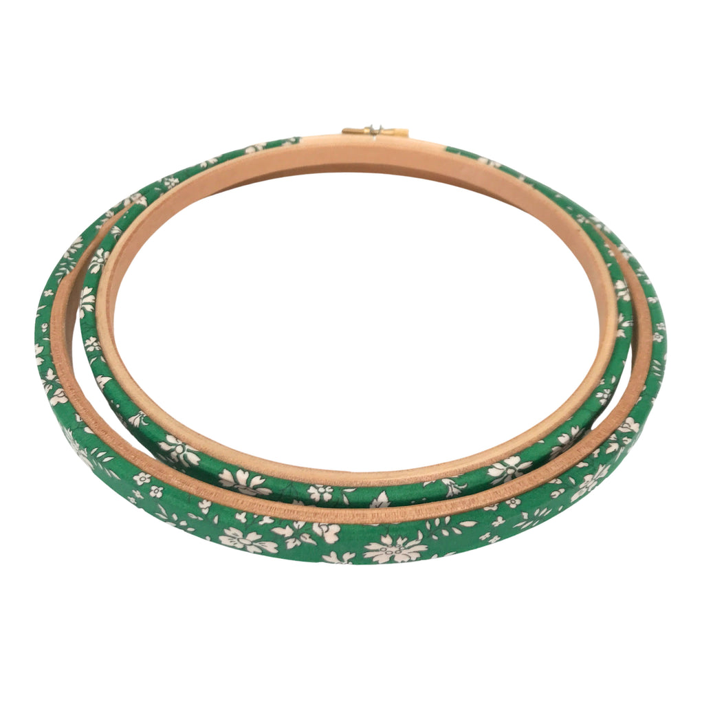 These beautiful, high-quality wooden hoops are hand-wrapped with a richly coloured Green Liberty fabric. Capel is a Classic Liberty floral print with white flowers and foliage on a vibrant Emerald green background. My hoops are perfect for finishing your beautiful hoop art projects.