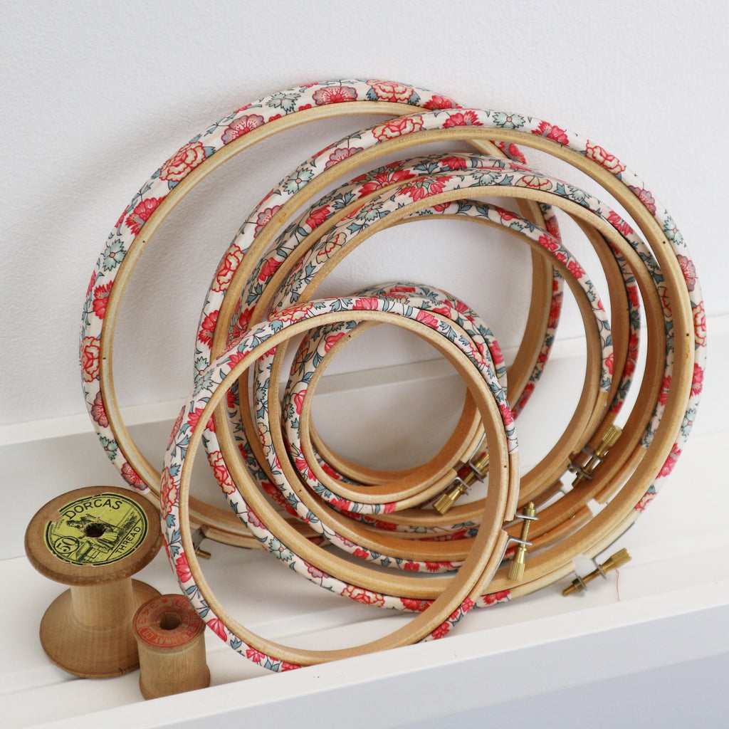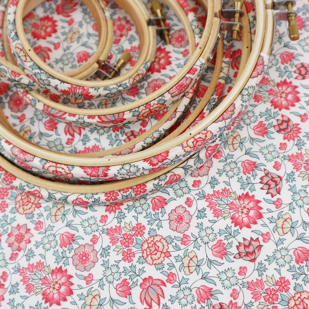 These pretty embroidery hoops are hand covered with a fine cotton fabric. This lovely Coral print is called Palampore, and is based on an archival Liberty furnishing fabric sample that dates from the 1880s. It features little floral blooms including roses and carnations.