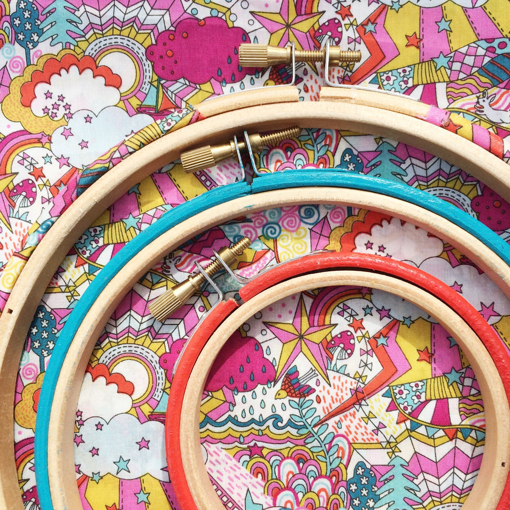 Land of Dreams, Brights. Liberty Fabric Covered Embroidery hoops