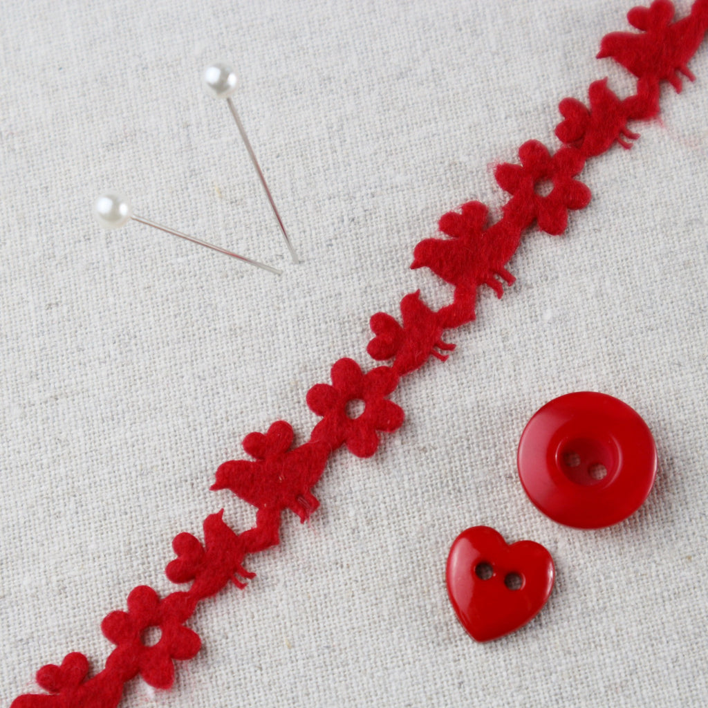 A red felt trim featuring a cute cut out bird, flower and heart motif.