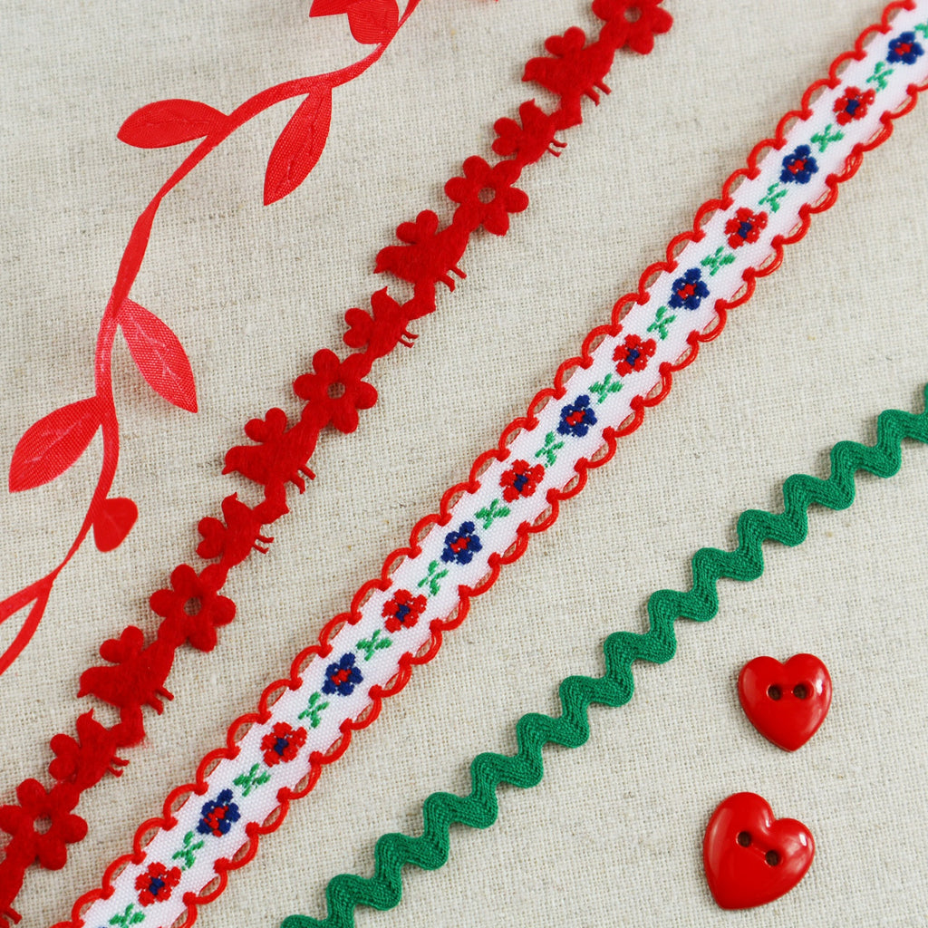An adorable woven tape with red ad blue daises and a pretty scalloped edge.