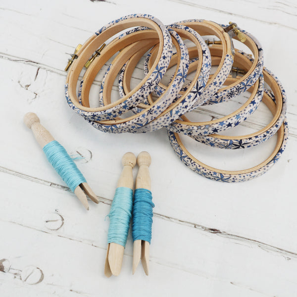 Blue, Patterned Embroidery Hoops. Petal and Bud Print.