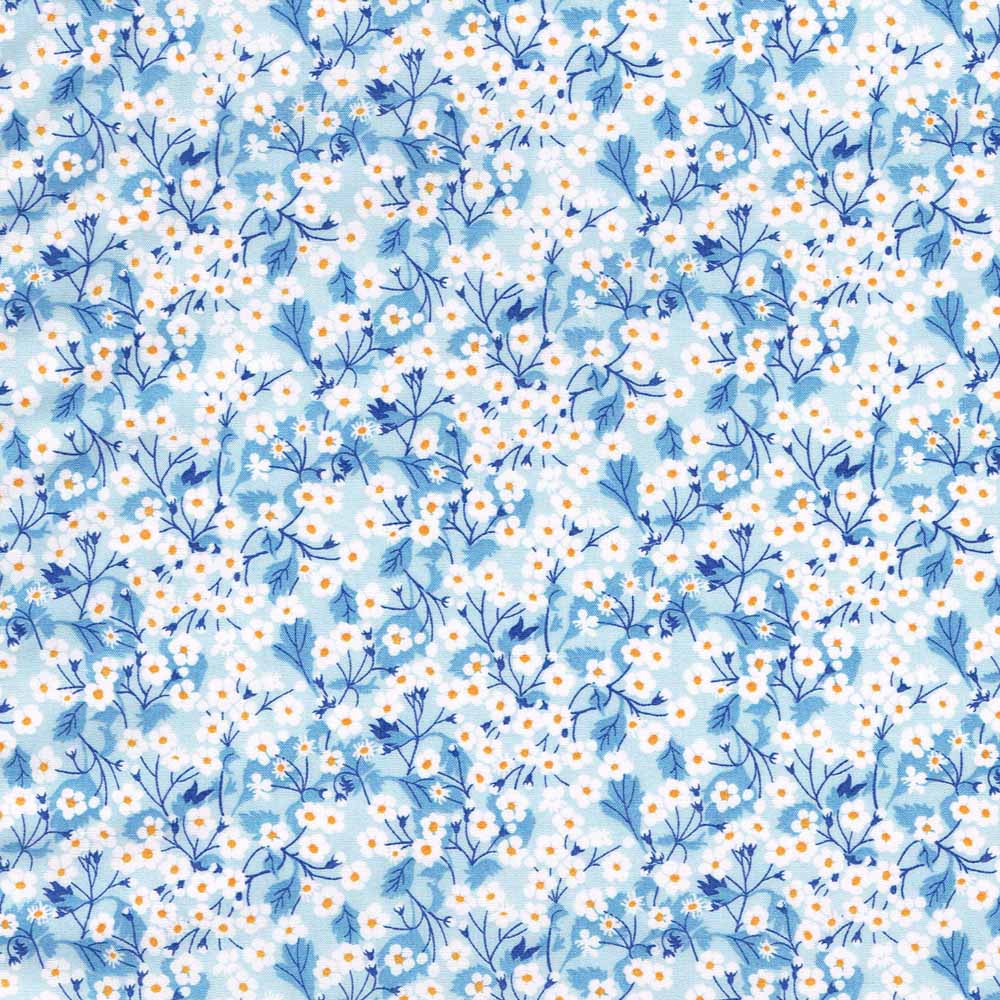 ‘Mitsi Valeria’ print has a sky blue background with pretty white flowers. The design features navy blue leaves and pops of yellow in the centre of the flowers.
