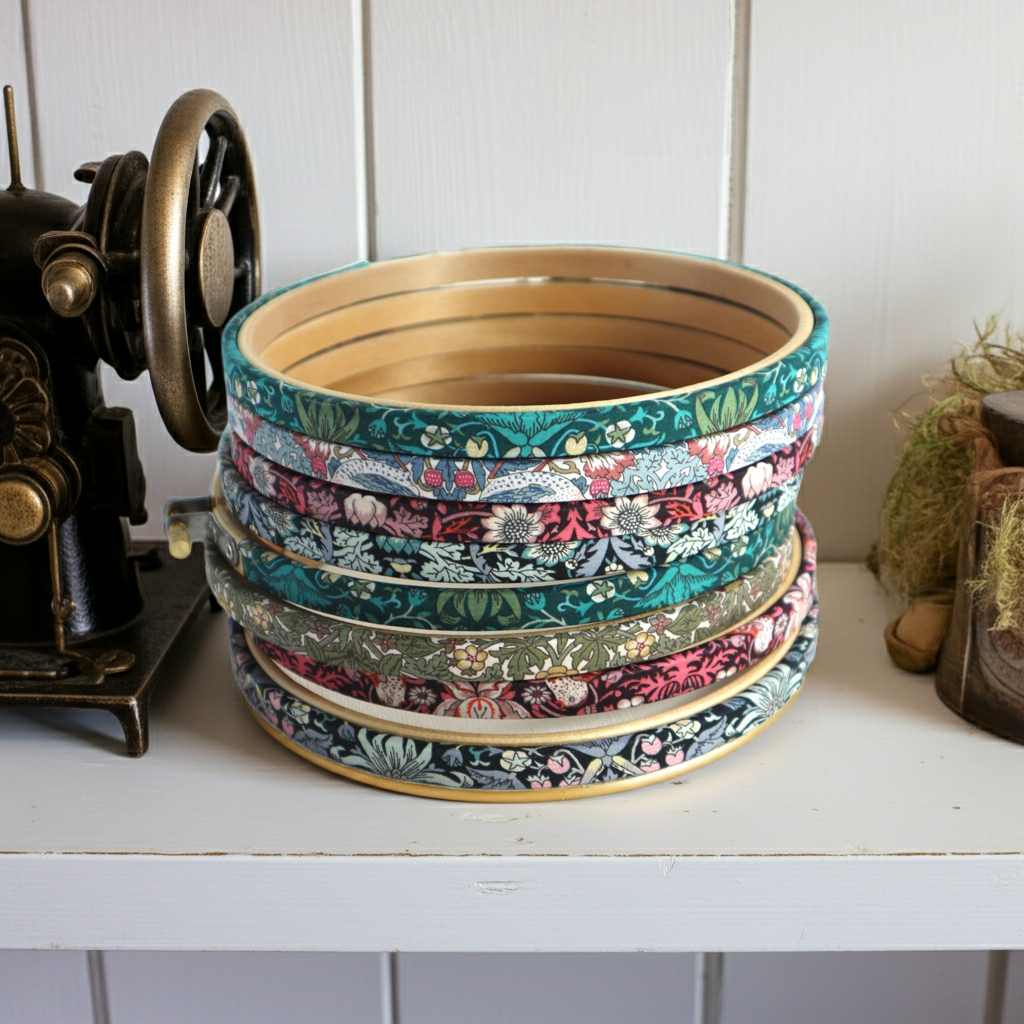 - I always use a Wooden Base Hoop (NOT BAMBOO): My wooden hoops are a far higher quality than the flimsy bamboo hoops you will find elsewhere. Because of their sturdy nature, they will keep your fabric taut, ensuring you can use my fabric-covered hoops as a working frame as well as a decorative frame.