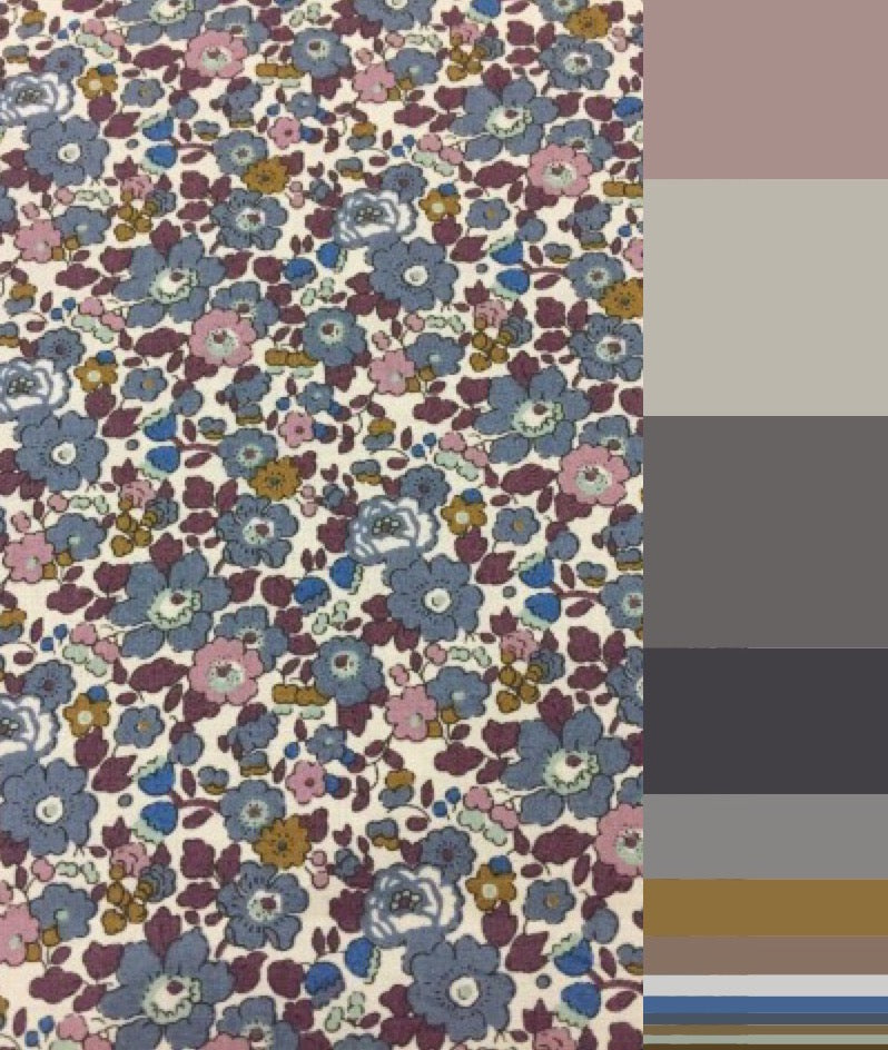 This colour way features Fig Grey and Taupe blooms with Aubergine foliage. My quality wooden embroidery hoops are hand wrap with beautiful Tana Lawn Cotton for a smooth professional finish. Betsy Ann is derive from Betsy, one of Liberty Of Londons most recognisable and well loved designs. This print features pretty little Peonies.