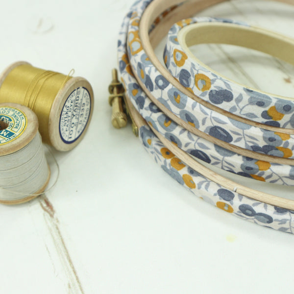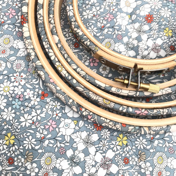 Grey, Fabric Covered Embroidery Hoops. June Meadow Print