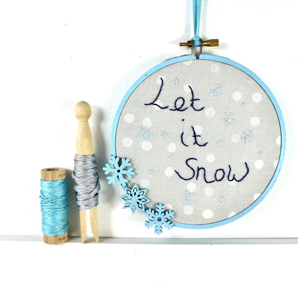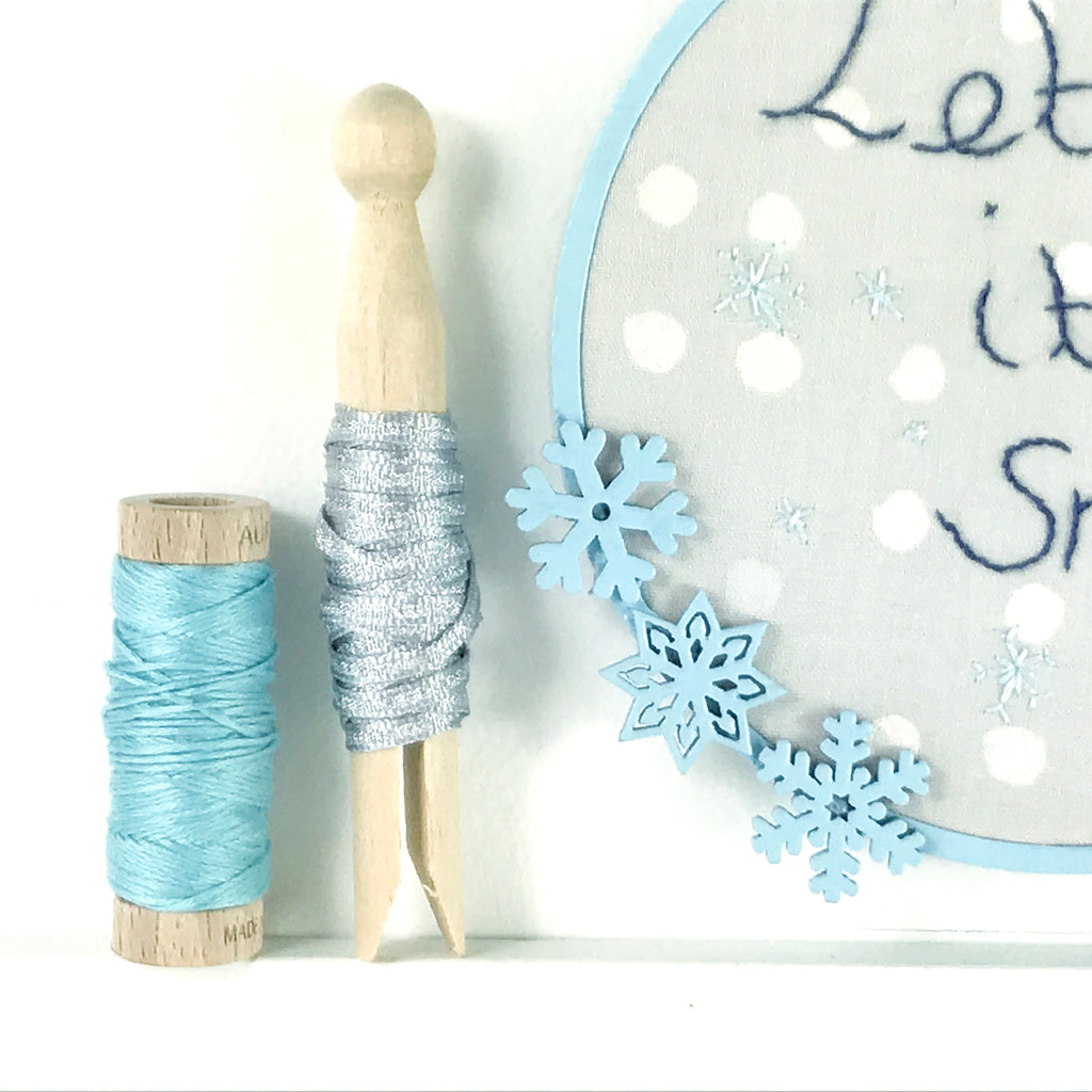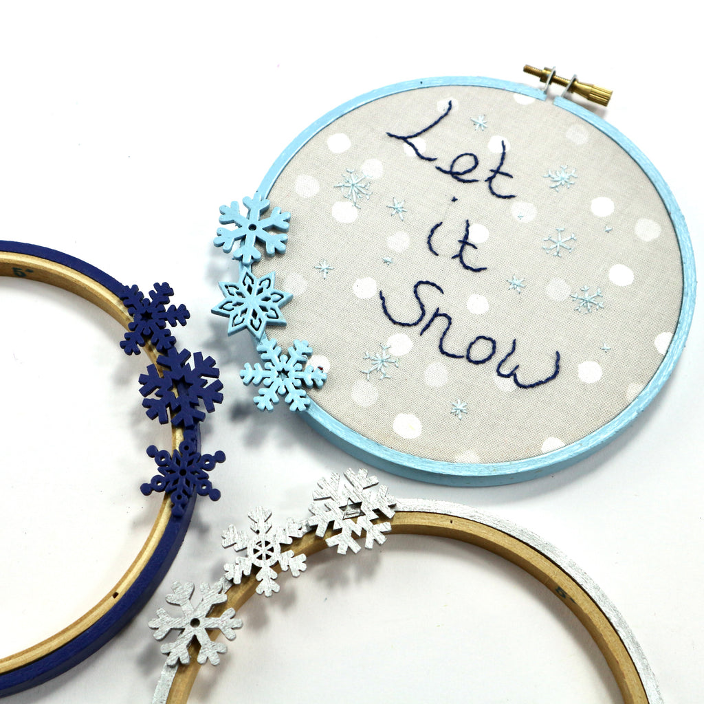 This unique embroidery hoop will set your work apart and make your work truly stand out. I have added little Snowflake embellishments and mounted them on 6 inch embroidery hoops before painting in your selected colour. Choose from. Light Blue, Midnight Blue, White or Silver.