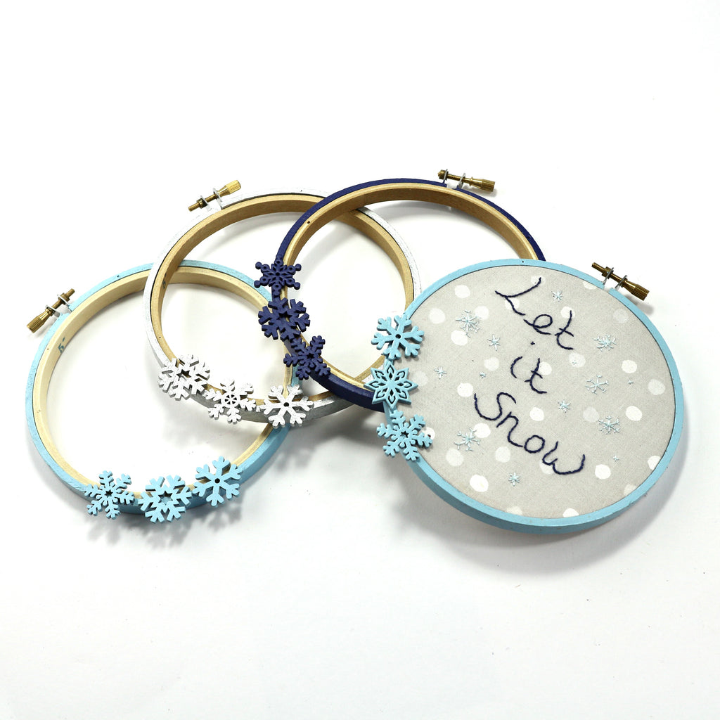 Hand painted 6 inch embroidery hoops with 3D Snowflake details.