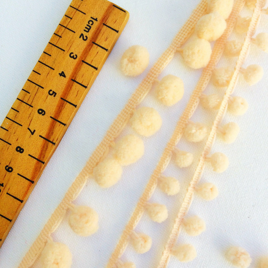 This is a pale peachy, pink Pom Pom trim and is available in a choice of two sizes. Choose from either the mini pom pom with a 10 mm diameter (1 CM) or a slightly larger trim with a 15 mm pom pom diameter.