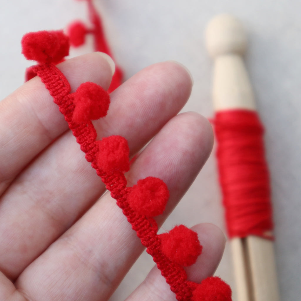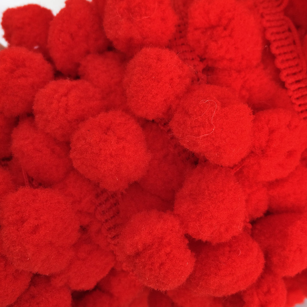 This is a vibrant red Pom Pom trim. This trim available in a choice of two sizes. Choose from either the mini pom pom with a 10 mm diameter (1 CM) or a slightly larger trim with a 15 mm pom pom diameter.