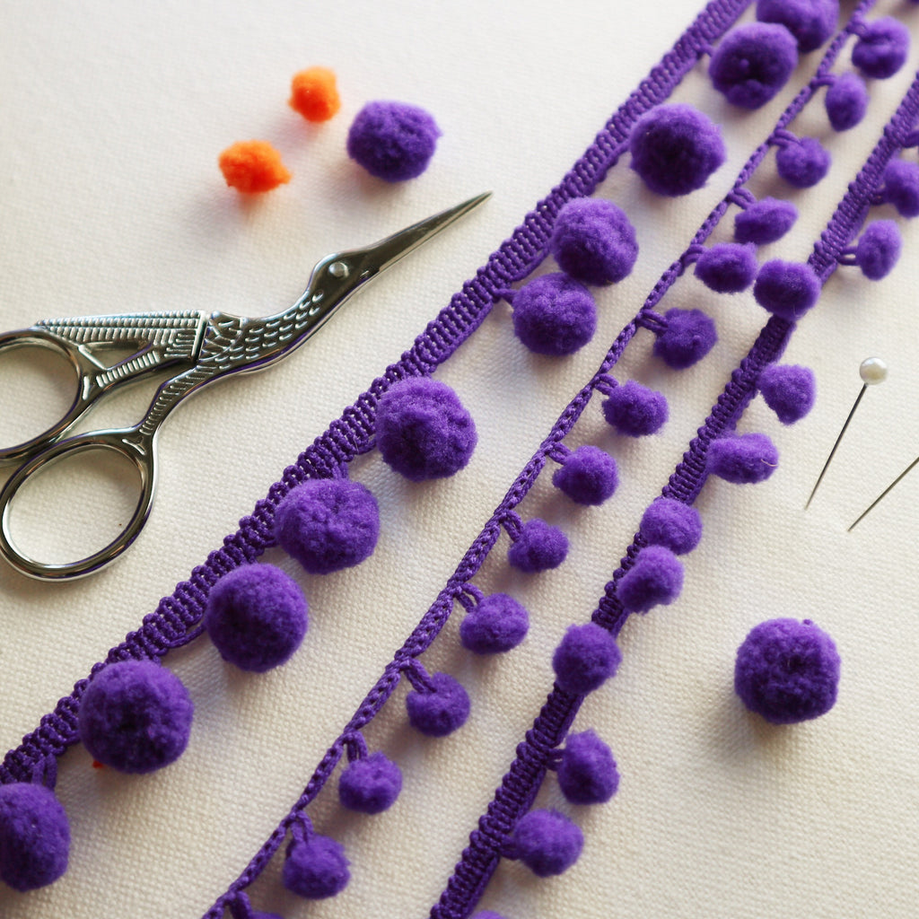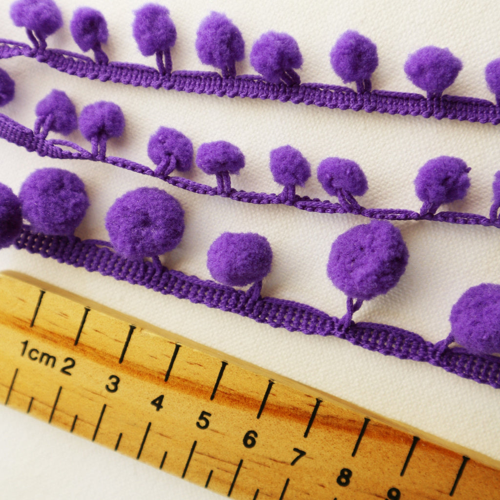 This is a beautiful, Rich, Royal Purple Pom Pom trim. This deep purple pom pom is available in a choice of two sizes. Choose from either the mini pom pom with a 10 mm diameter (1 CM) or a slightly larger trim with a 15 mm pom pom diameter.