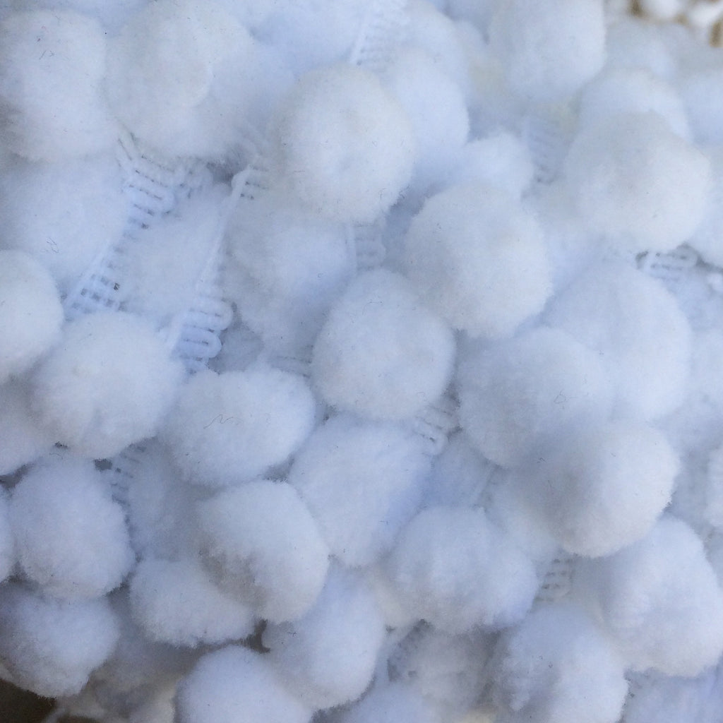 This is a crisp white pink Pom Pom trim and is available in a choice of two sizes. Choose from either the mini pom pom with a 10 mm diameter (1 CM) or a slightly larger trim with a 15 mm pom pom diameter.