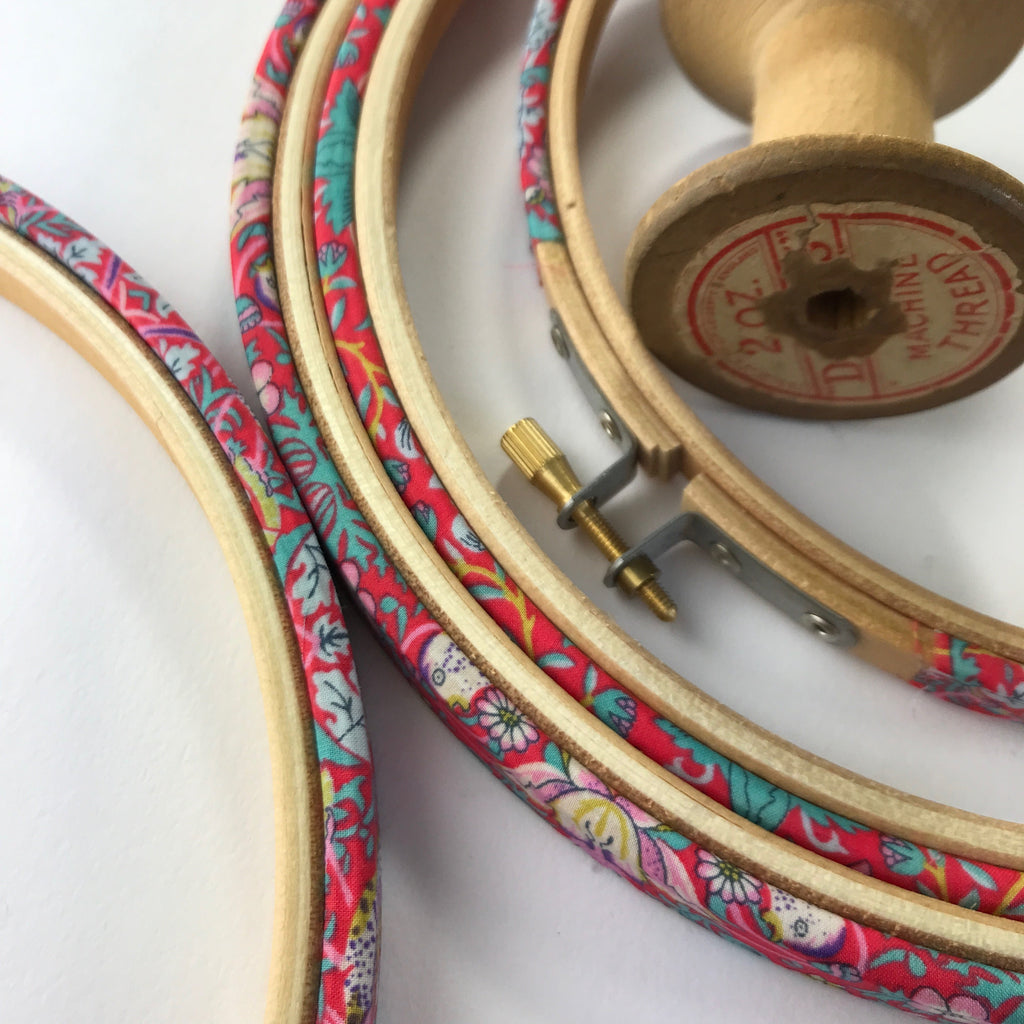 Embroidery hoops are a fantastically easy way to create your own wall art. Simply secure your work or decorative fabric of your choice within the hoop and hang it on the ribbon of your choice. All my hoops come with an easy-to-follow framing tutorial.