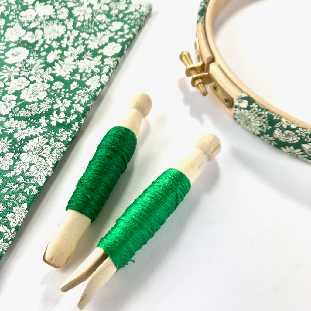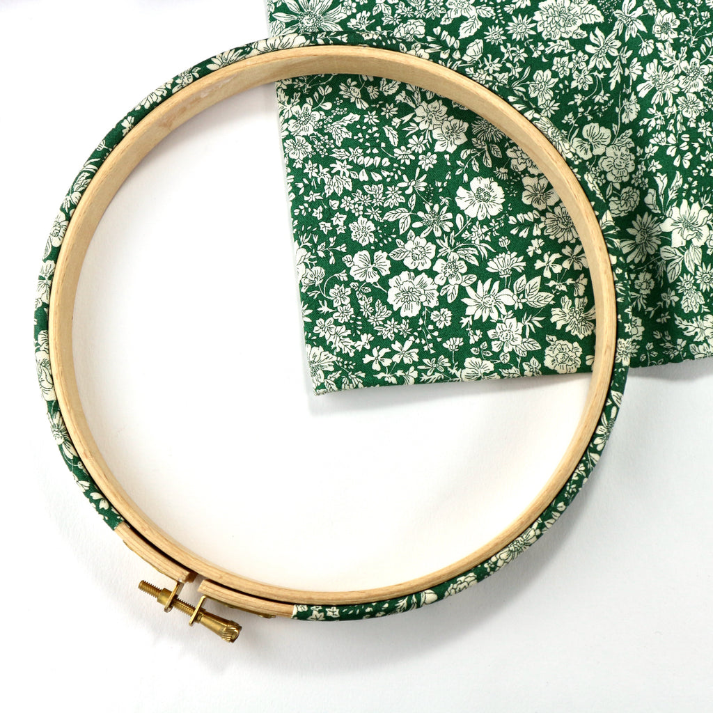 Evergreen, Fabric Covered Embroidery Hoops. Liberty Emily Belle Print, Lasenby Quilting Fabric.