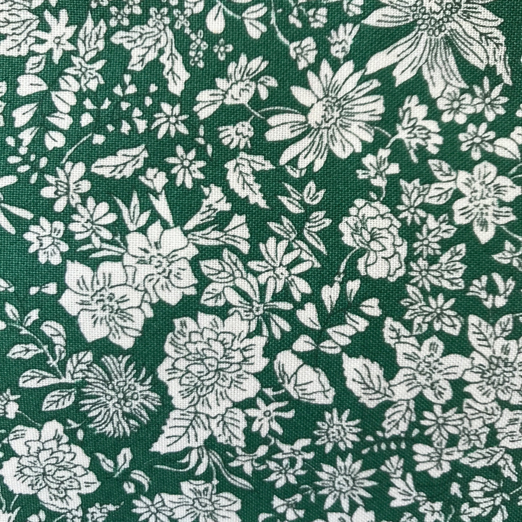 Emily Belle is described as 'a celebration of botanicals including daisies, marguerites, peonies and cornflowers. Drawn in outline and arranged over a plain coloured ground the soft, fine lines and delicate tonal qualities are designed to coordinate smoothly with a wide variety of Liberty prints from our vast archive, for a seamless mix-and-match effect.'