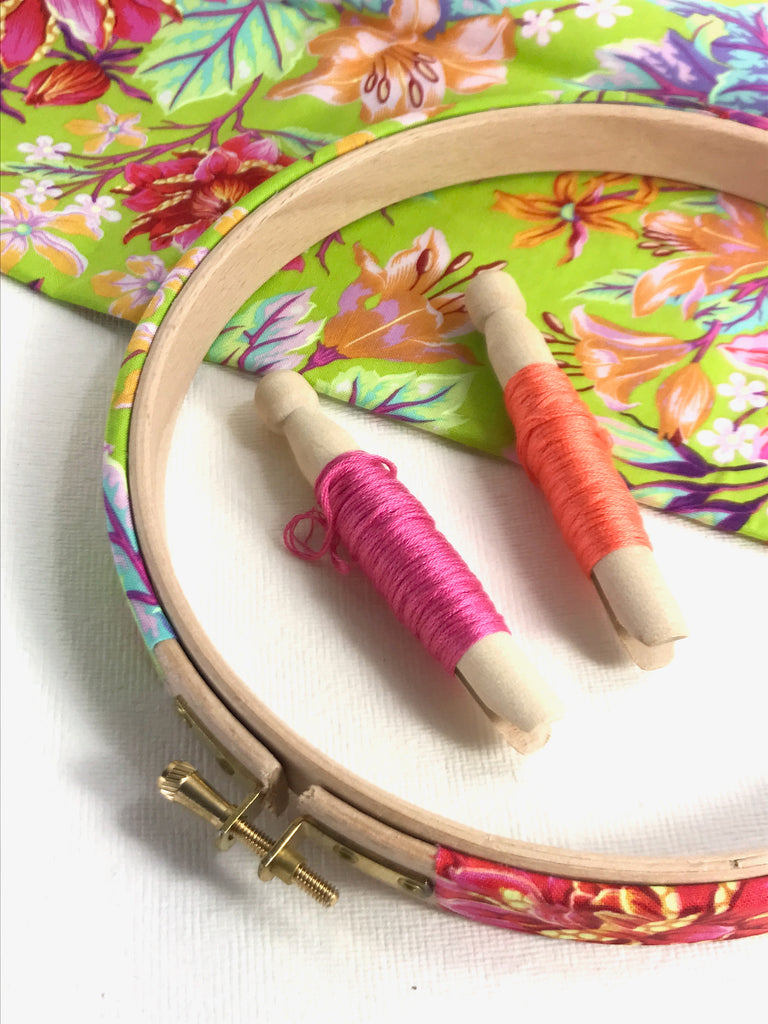 Green Embroidery Hoop Frame, wrapped in Tula Pink fabric.