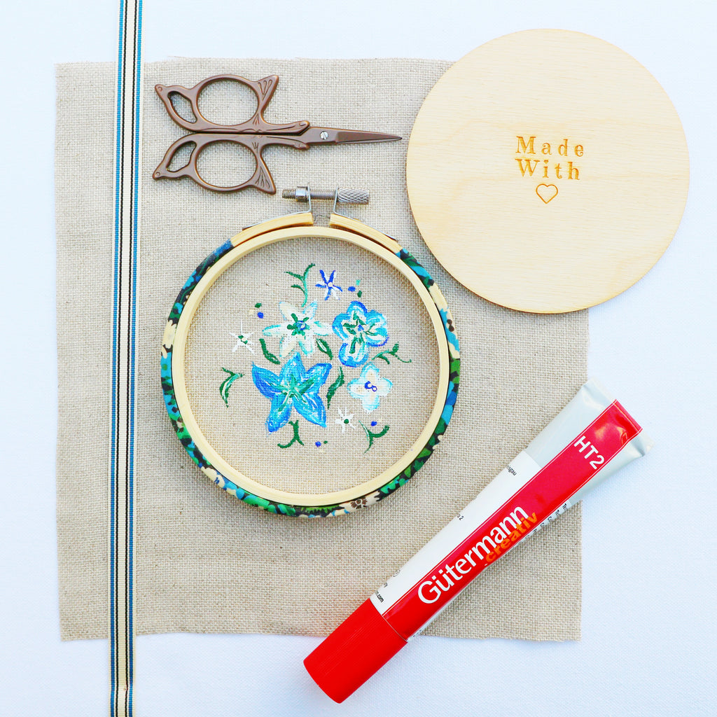 All my hoop backs come with an, easy to follow tutorial. You can glue my backs on with any craft glue but I recommend ‘Gutermann Textile Glue’ . It is solvent free and odourless. This glue dries nice and slowly giving you plenty of time to secure your fabric to the hoop and position the back before the glue sets.