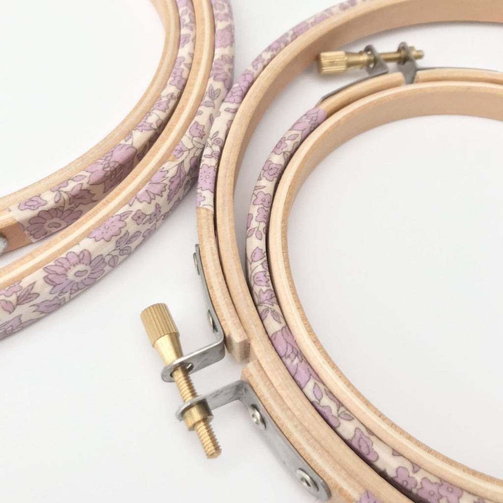Lilac, Fabric Covered Embroidery Hoops. D'Anjo Coast Print