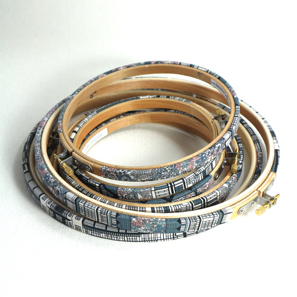 Grey Blue, Fabric Covered Embroidery Hoops. Betsy P Print