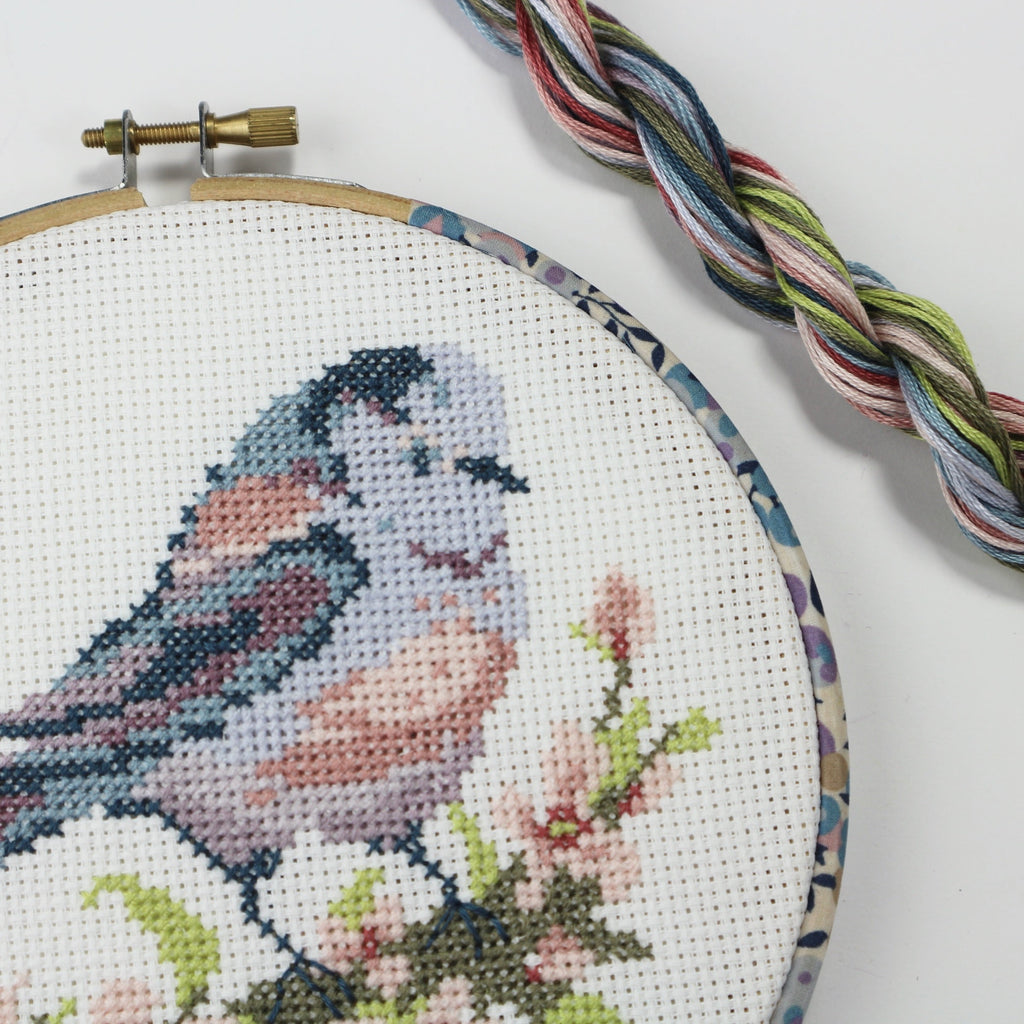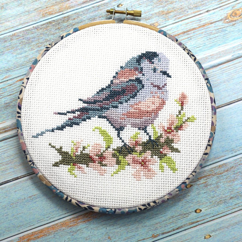 This pretty, Cross Stitch, wall hanging kits features a Long-tailed Tit, perched on delicate pink flowering blossom, branch. These cute little birds are found in the British country side and I couldn't resist designing this little guy because his colours are just so pretty. The cross stitch is design is complemented by one of my best selling decorative embroidery hoops.