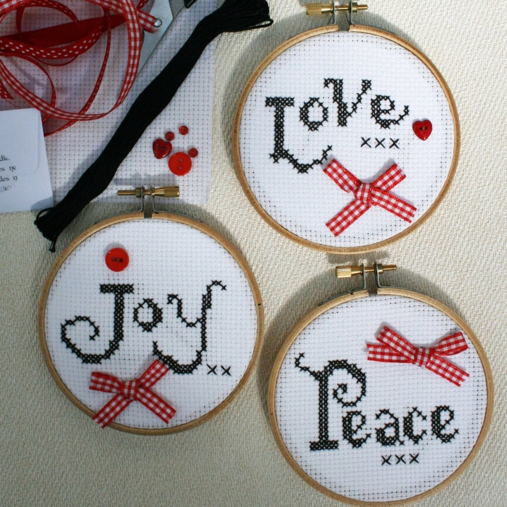 Love Joy and Peace Hoop Ornaments, Cross Stitch Kit.