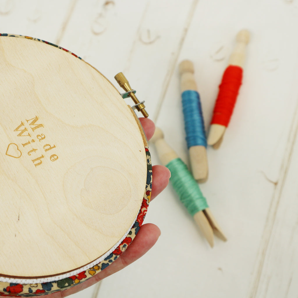 The beautifully hand finished embroidery hoops are hand covered with a colourful, Liberty's of London, Tana Lawn, Betsy Ann' cotton.
