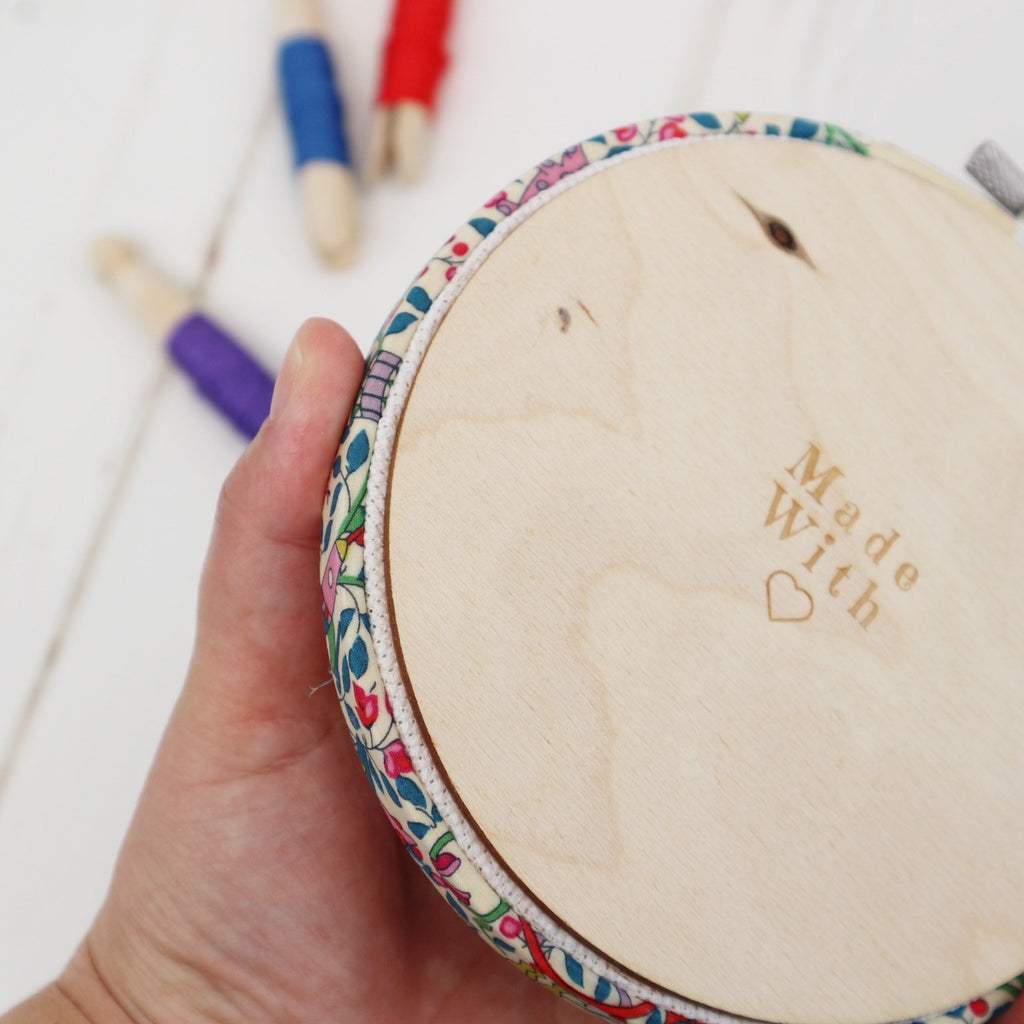 Although this design has been a best seller for some time it has an has just got better! This adorable kit now comes with complimentary patterned embroidery hoop hand covered with colourful Liberty’s of London fabric. Within the kit is an easy to follow finishing tutorial and a unique wooden back so that your work looks as beautiful from the back as it does from the front.