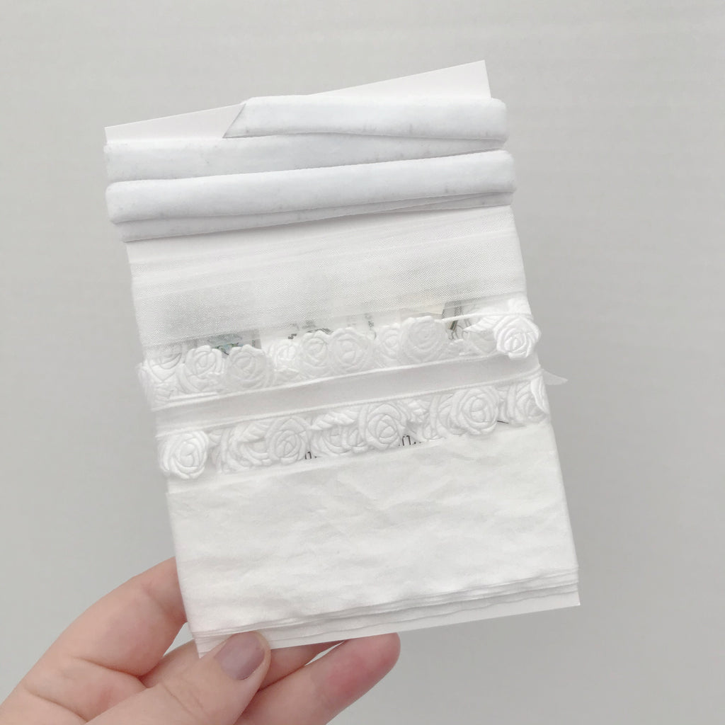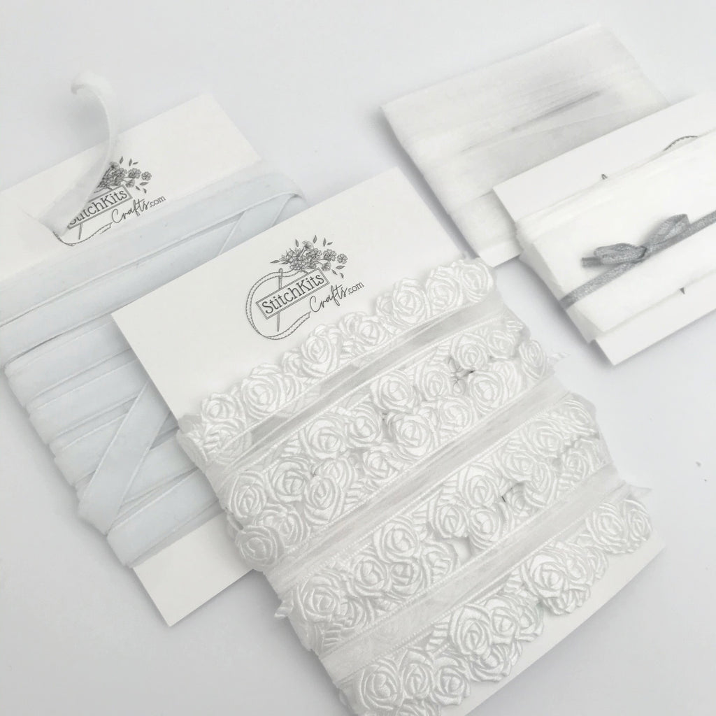 This is a beautiful collection of White ribbons in different, luxury textures. The luxury collection of ribbons will add elegance to your Wedding day. This unique collection of ivory coloured trims is perfect for styling your special day and features four luxury trims is shades of complimentary creams.