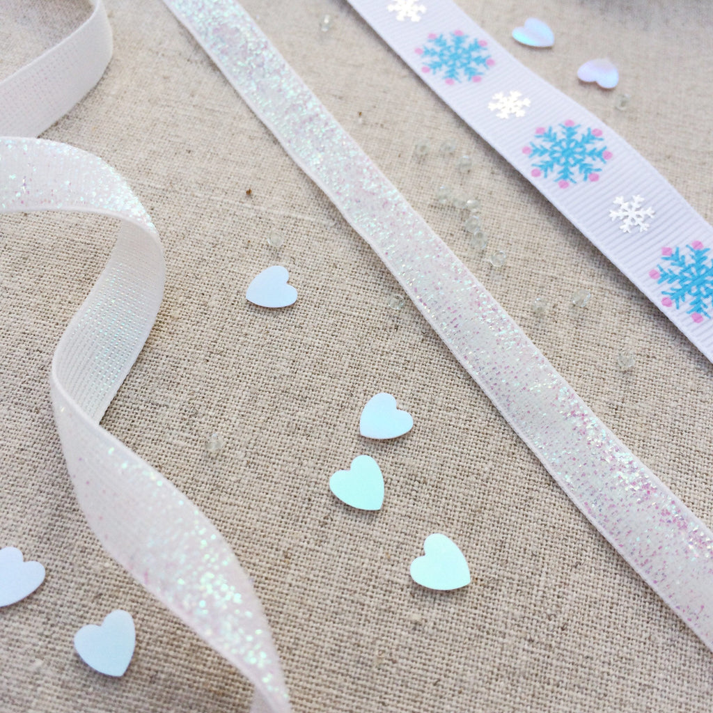 White Iridescent Glittery Velvet: ribbon adds a bit of bling to this collection the super sparely, velvet style ribbon is 10 mm wide,