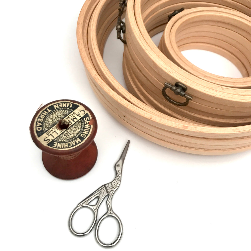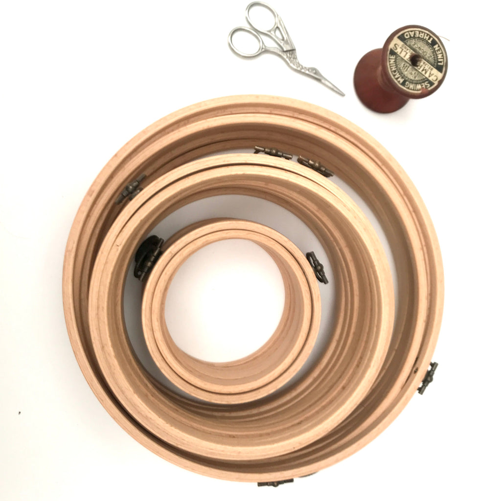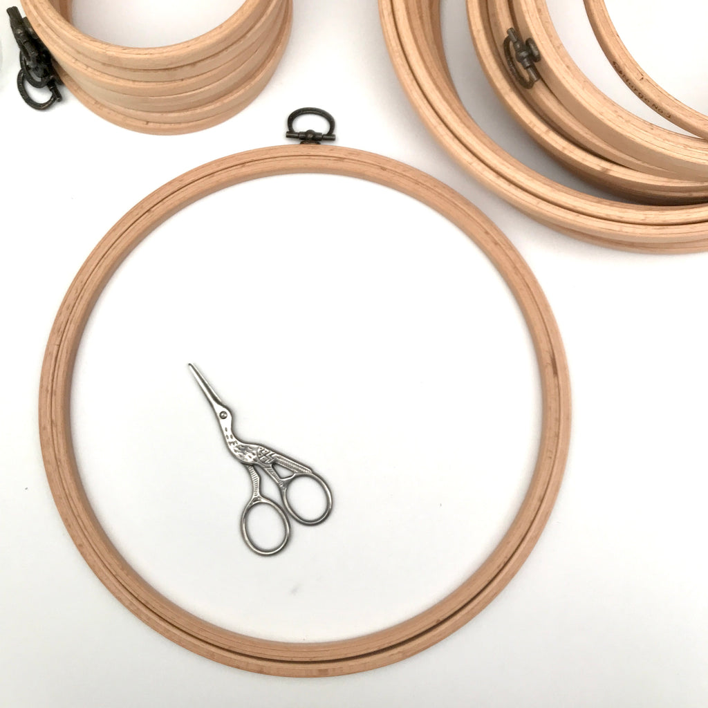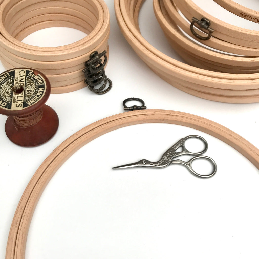 These 'Nurge' Beech hoops are the Rolls Royce of embroidery hoops and are designed as a way to hang your work. Instead of a screw they are finished with a decorative hanging loop.