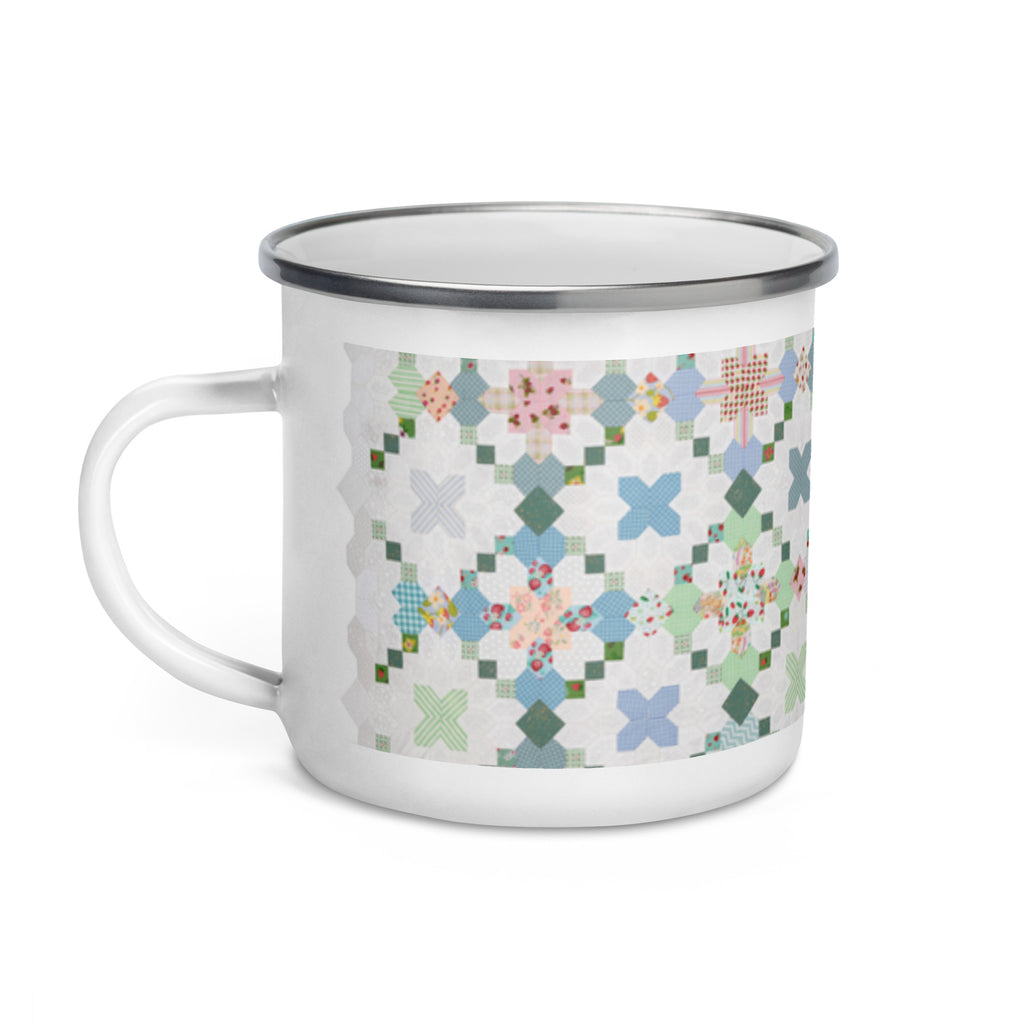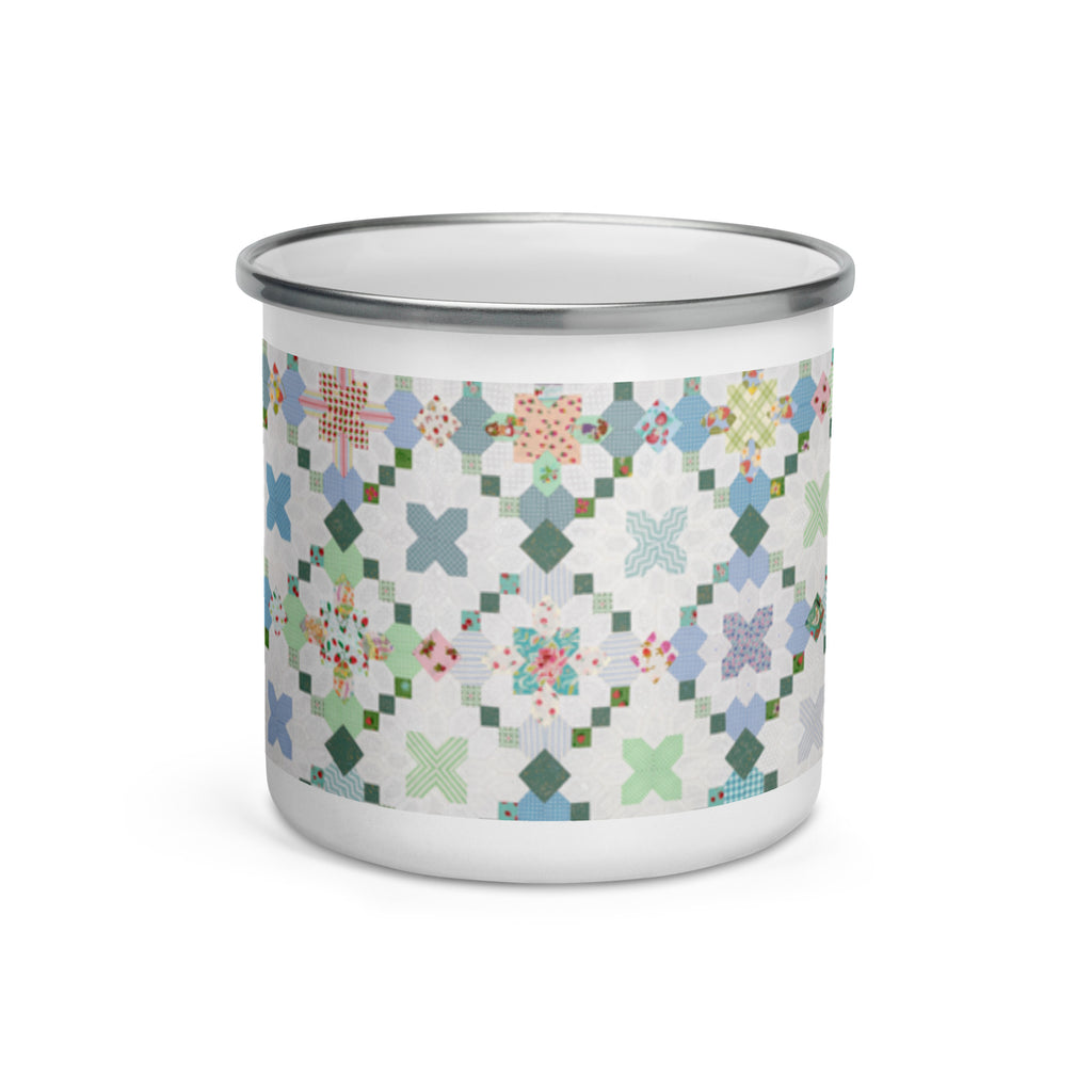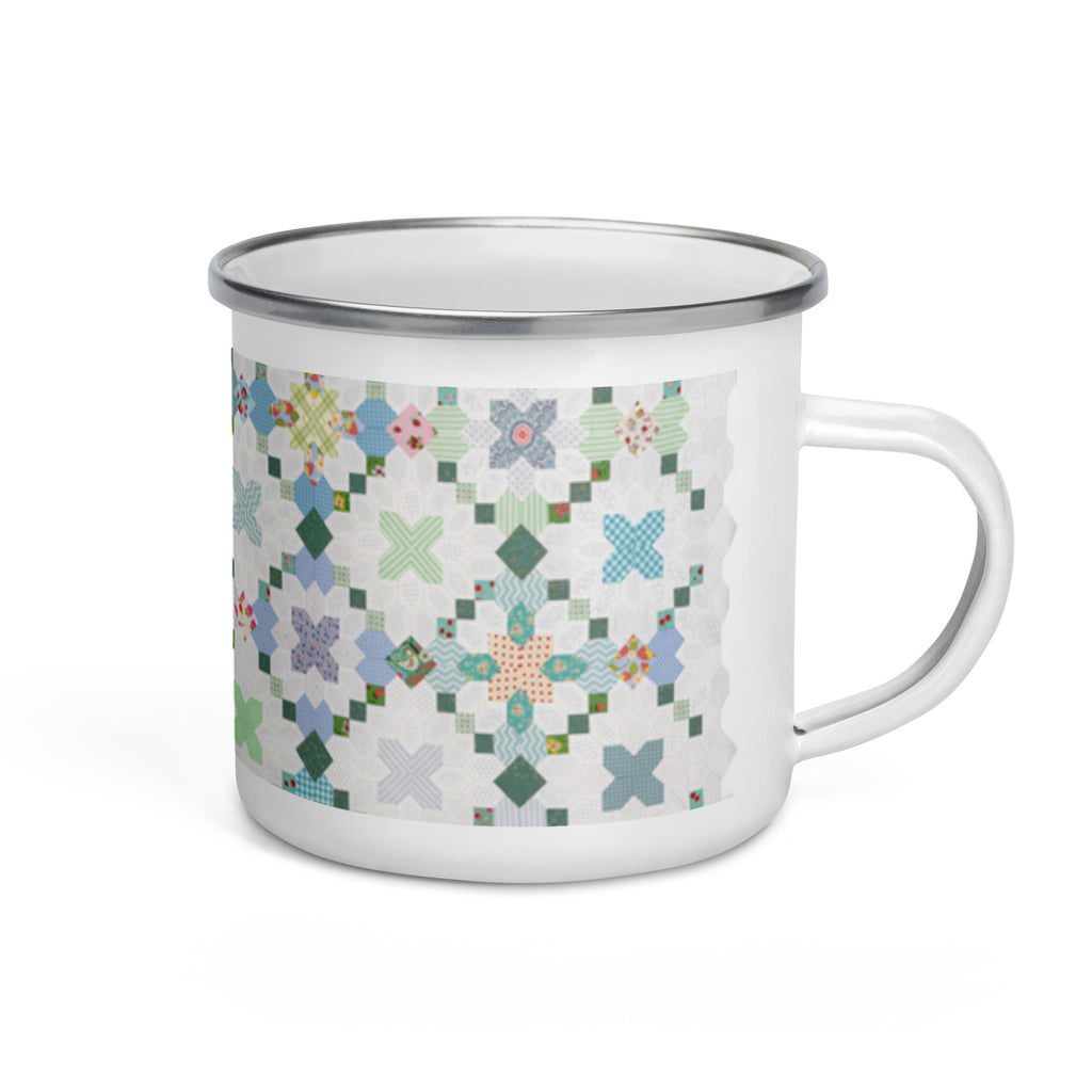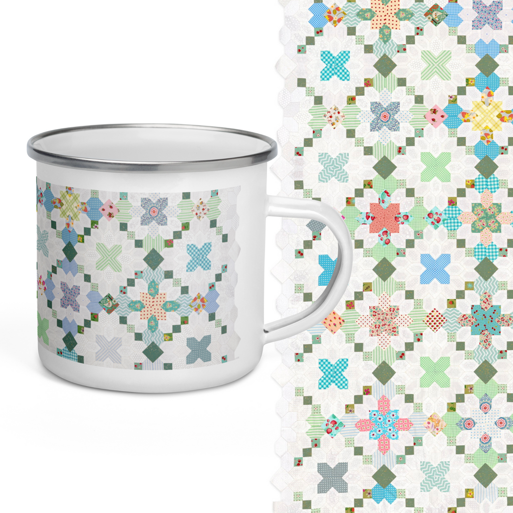 These lovely enamel mugs feature my hand-stitched quilt. My fresh adaptation of the classic Lucy Boston is inspired by summer days and country picnics.