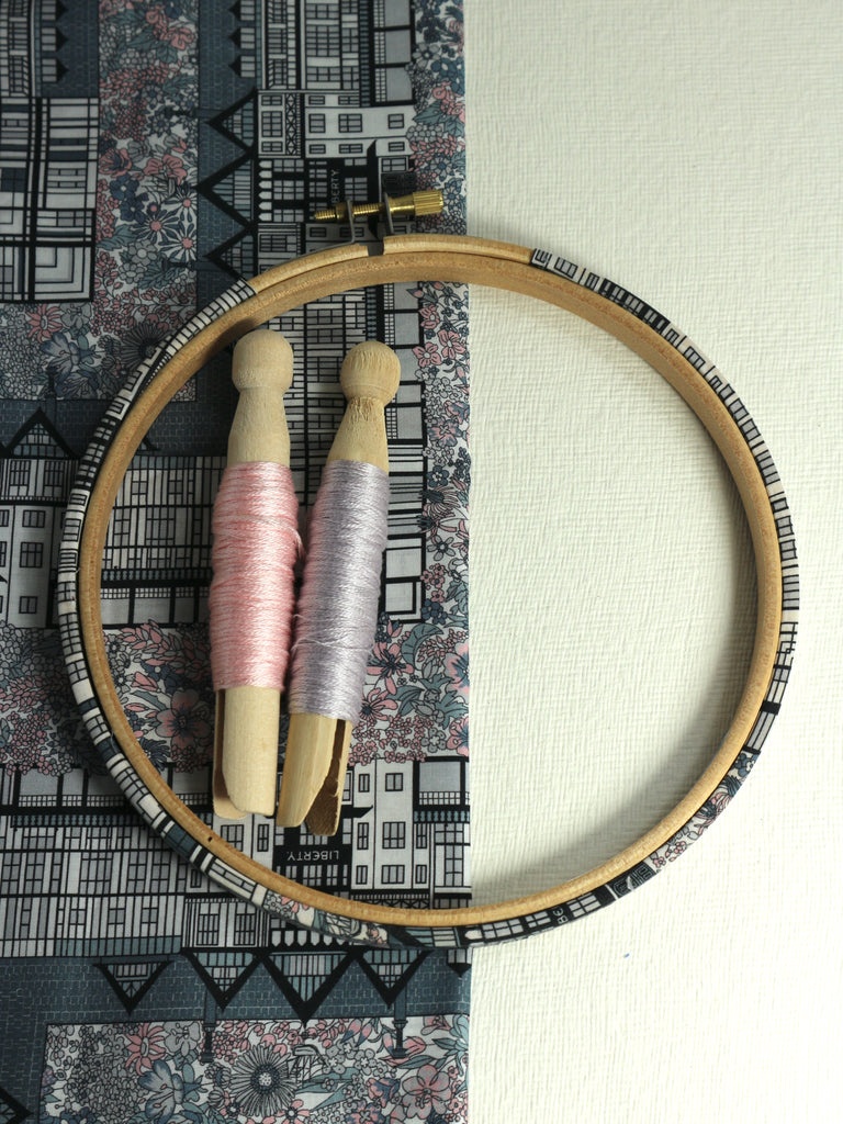 This embroidery hoop is wrapped in 'Tudor Rose' fabric. The design is a celebration of all things liberty, featuring the historic building on Regent Street.