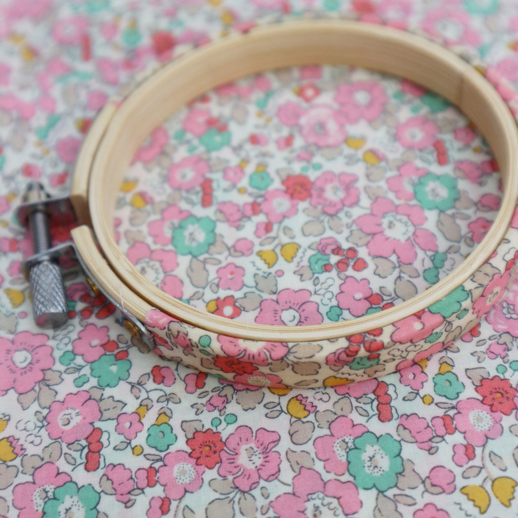 This colour way features pretty pink and mint green blooms with baby pink foliage and gold buds. My quality wooden embroidery hoops are hand wrap with beautiful Tana Lawn Cotton for a smooth professional finish. Betsy Ann is derive from Betsy, one of Liberty Of Londons most recognisable and well loved designs. This print features pretty little Peonies.