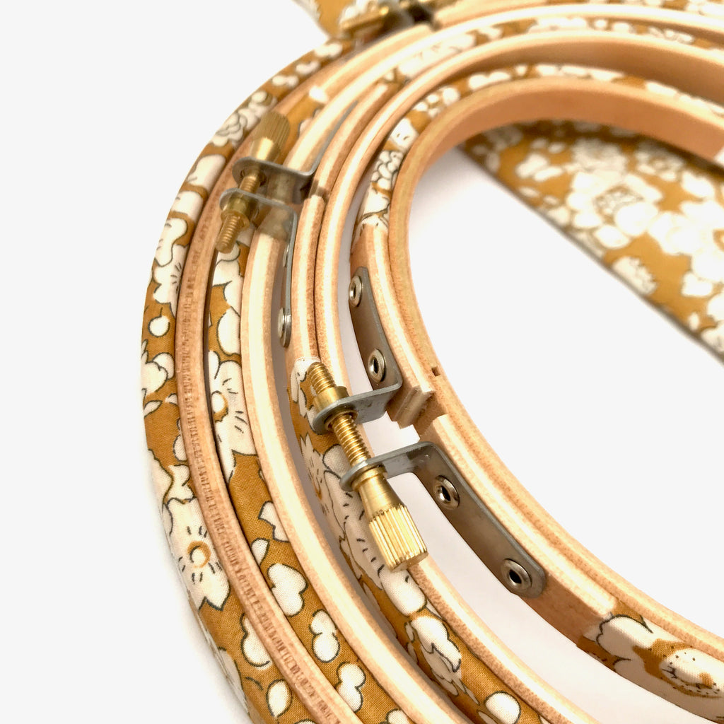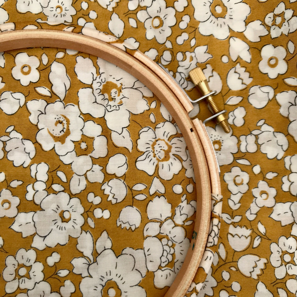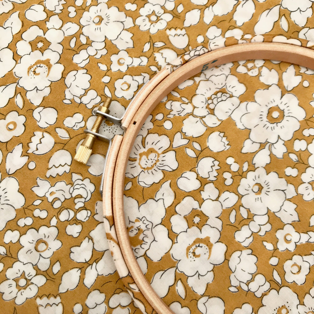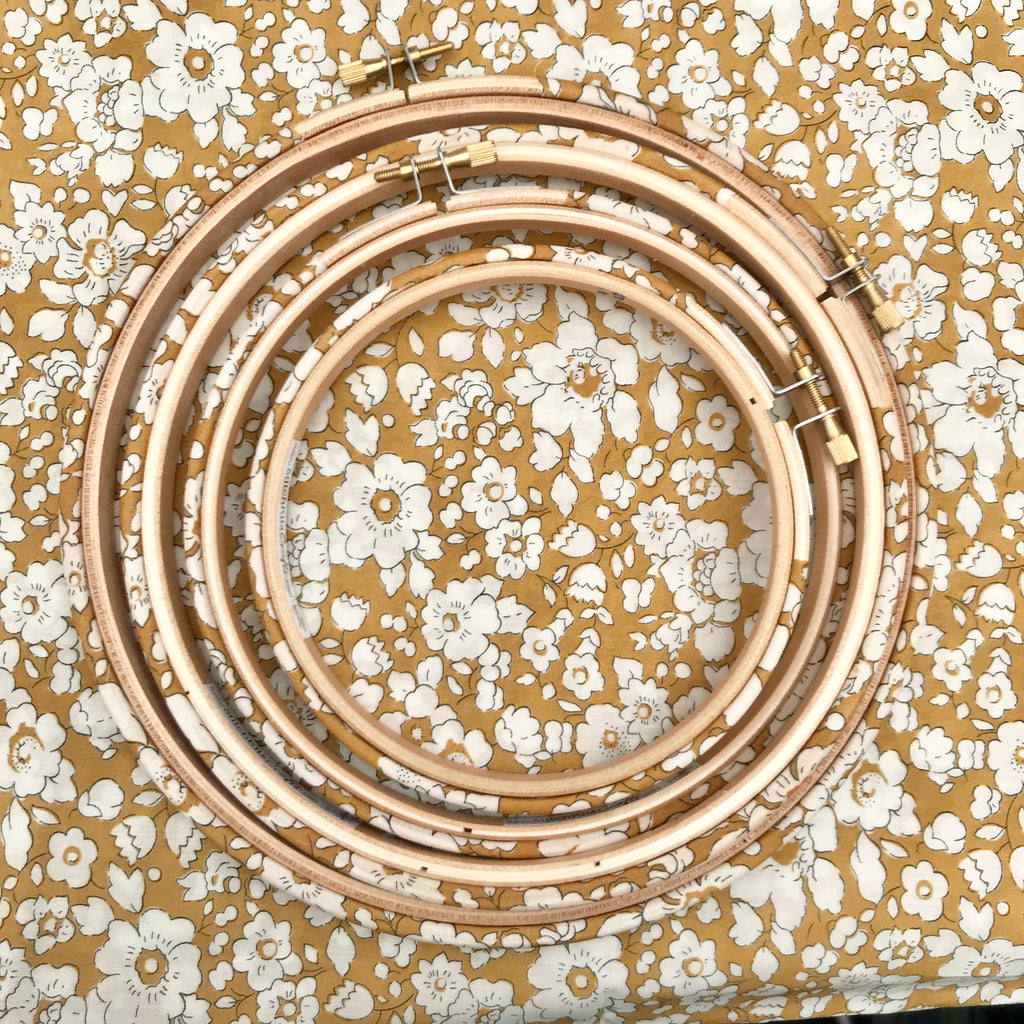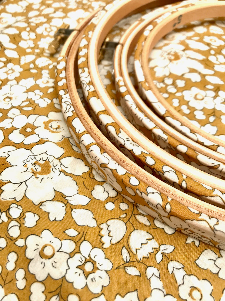 I use quality wooden embroidery hoops and hand wrap them with beautiful Tana Lawn Cotton for a smooth professional finish.