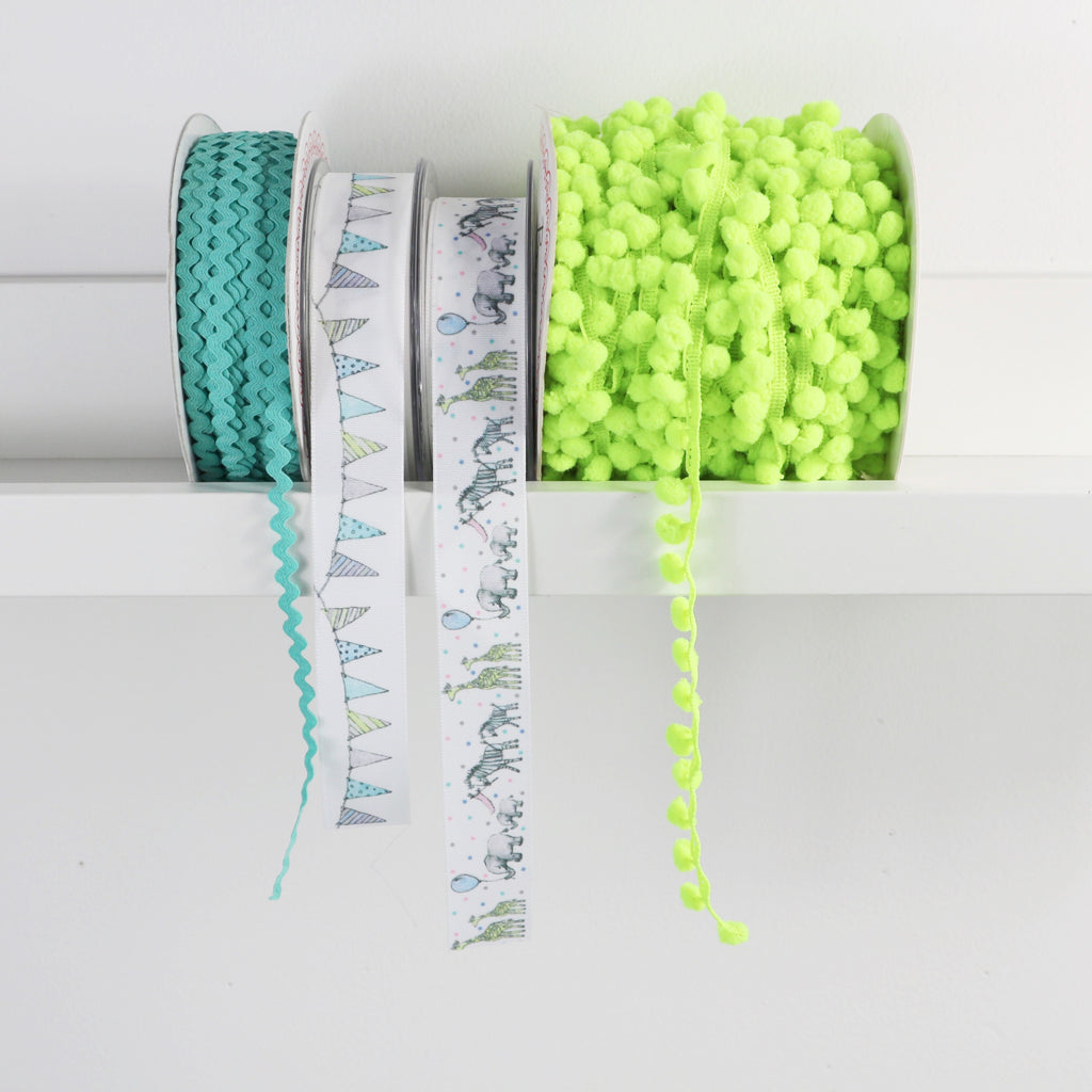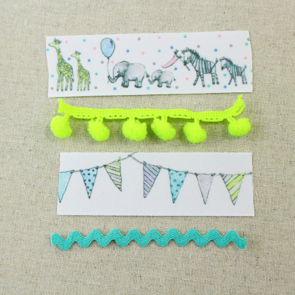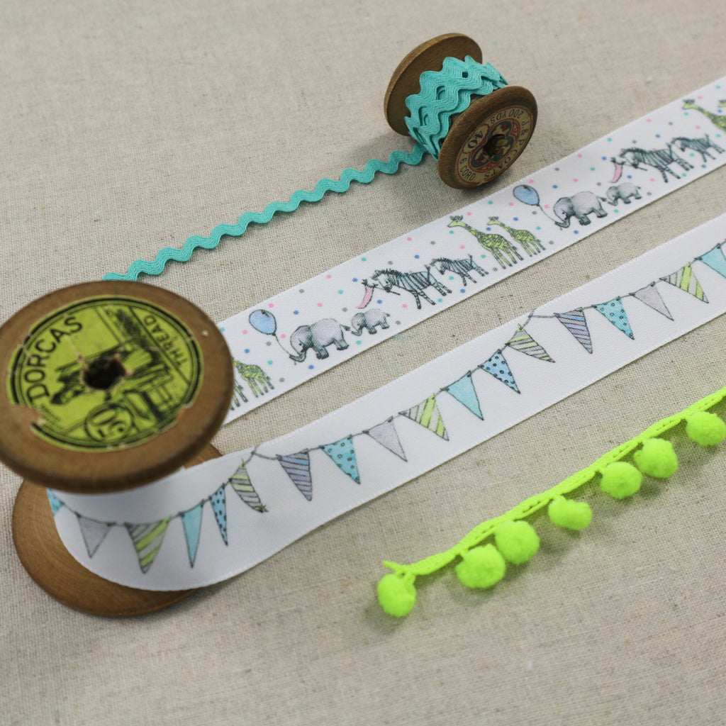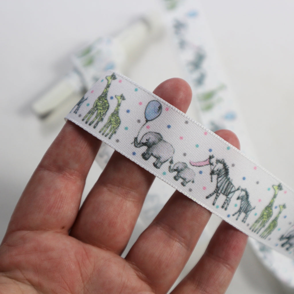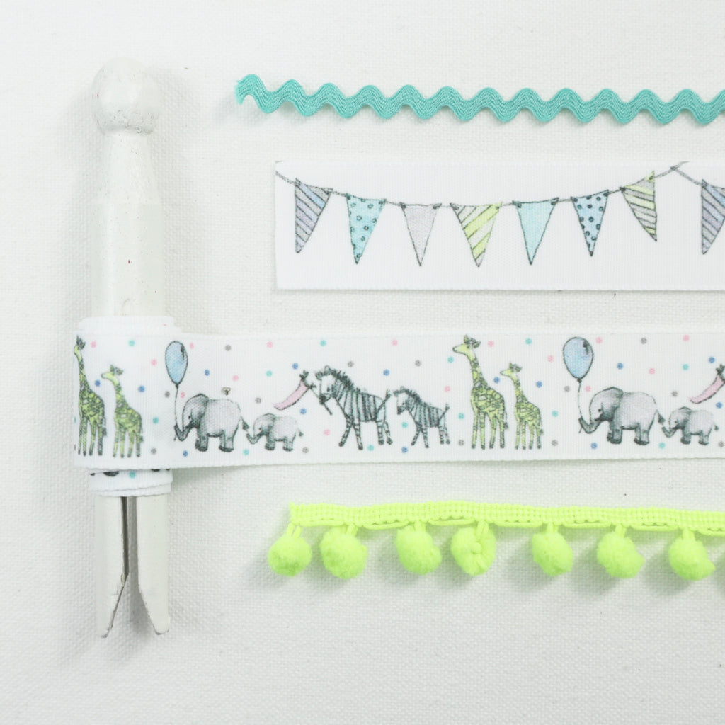 This is an adorable collection of ribbons which I have hand selected to compliment each other is perfect for gift wrapping or styling your baby shower. The zesty neon adds a modern and fresh pop of colour while the parade of animals, clutching party balloons could not be cuter.