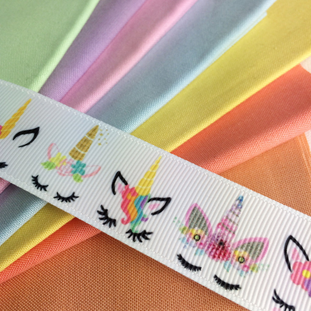 1 meter of Sleepy Unicorn print: this is a 25 mm wide white grosgrain ribbon with a floral unicorn horn design.