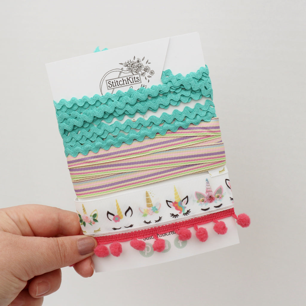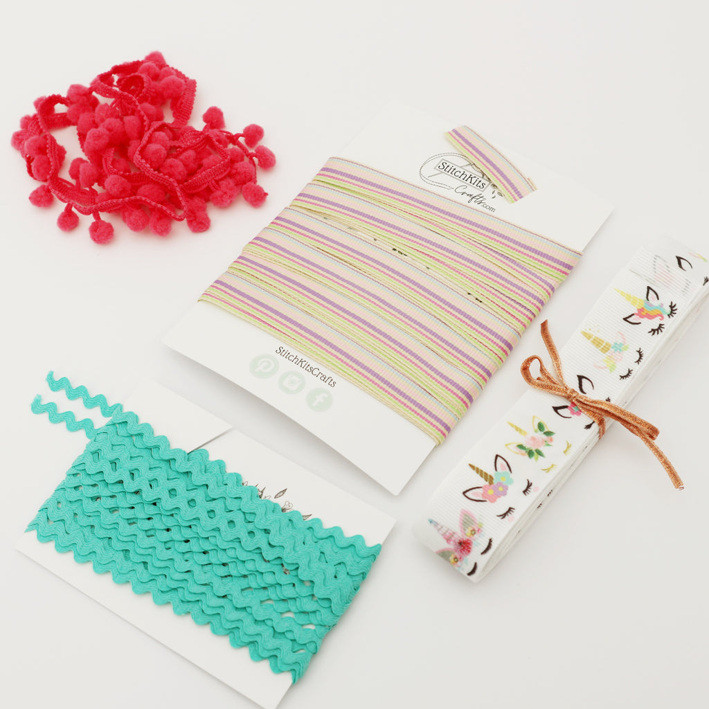 Embrace the mystical world of fairy tales with this adorable collection of five different ribbons and trims. This collection has been selected to compliment the cute sleepy Unicorn print with its floral horn.
