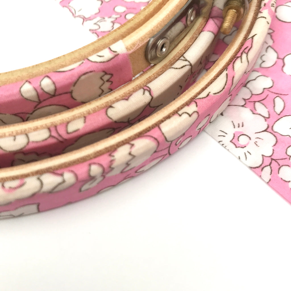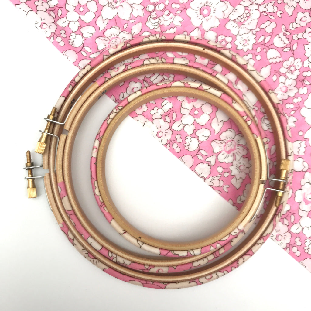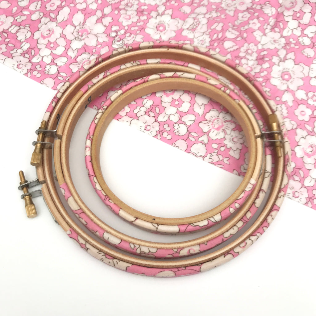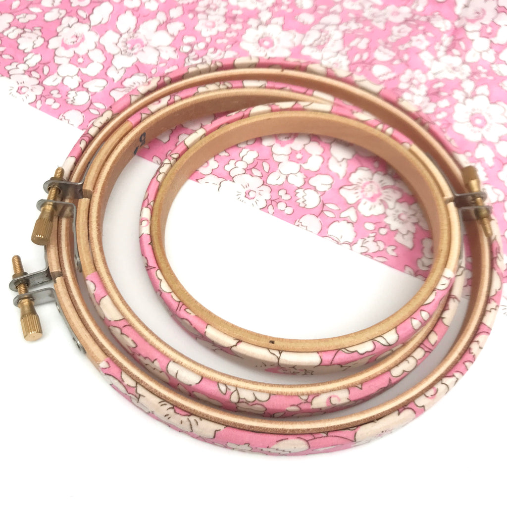 I use quality wooden embroidery hoops and hand wrap them with beautiful Tana Lawn Cotton for a smooth professional finish.